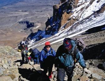 You leave the glades of the rain-forest and follow an ascending path on the open moorlands to the Horombo Huts. Views of Mawenzi and the summit of Kibo are amazing. Look for giant lobelias and grounsels. You may begin to feel the affects of the altitude.